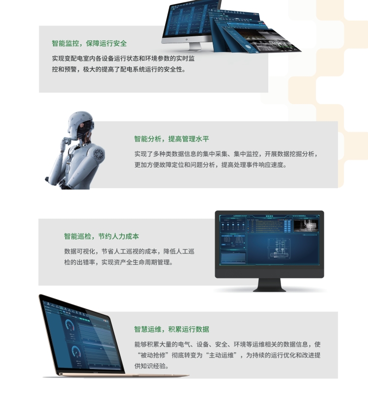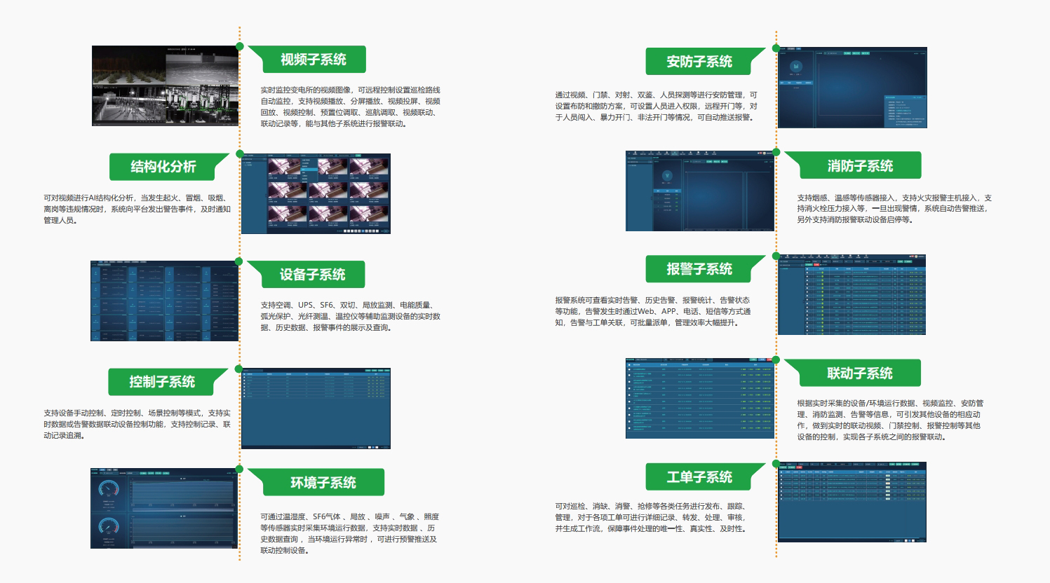 鐵路變電所輔助監(jiān)控系統(tǒng)包含視頻、設(shè)備、環(huán)境、安防、消防、報警、聯(lián)動、工單子系統(tǒng),系統(tǒng)基于新一代人工智能、大數(shù)據(jù)分析技術(shù)、視頻結(jié)構(gòu)化分析技術(shù)等,對全站所主要電氣設(shè)備、關(guān)鍵設(shè)備安裝地點以及周圍環(huán)境進行全天候狀態(tài)監(jiān)視和智能控制,控制環(huán)境、視頻、安防、消防、設(shè)備、工單等輔助子系統(tǒng)進行集成,由監(jiān)控后臺完成整個系統(tǒng)的全面監(jiān)控,實現(xiàn)信息共享、告警聯(lián)動等功能。