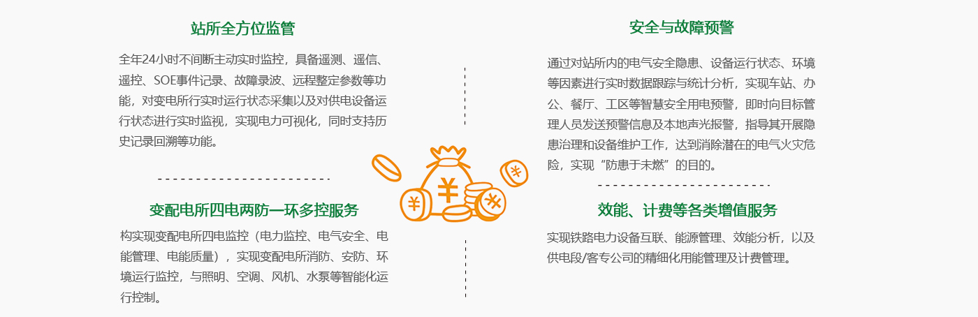鐵路電力運維管理系統(tǒng)采用電力監(jiān)控、電氣安全、電能質(zhì)量、用能管理、視頻監(jiān)控、輔助監(jiān)控、資產(chǎn)管理等一體化功能設(shè)計,實現(xiàn)對鐵路變配電所的全方位監(jiān)管,具備遙測、遙信、遙控、SOE事件記錄、故障錄波、遠(yuǎn)程整定參數(shù)等功能,對電力運行狀態(tài)實時采集及監(jiān)視,全數(shù)據(jù)分析判斷,預(yù)案處理;集成運行維護(hù)管理、資產(chǎn)管理、環(huán)境監(jiān)控、門禁監(jiān)控、煙感監(jiān)控、視頻監(jiān)控等功能;用戶可通過后臺系統(tǒng)實時掌握變配電所整體運行狀況、獲取各類預(yù)警、報警事件,滿足電力無人或少人值守的需求,為用戶提供有效的專業(yè)技術(shù)保障及運維支撐,提高系統(tǒng)安全運行水平。