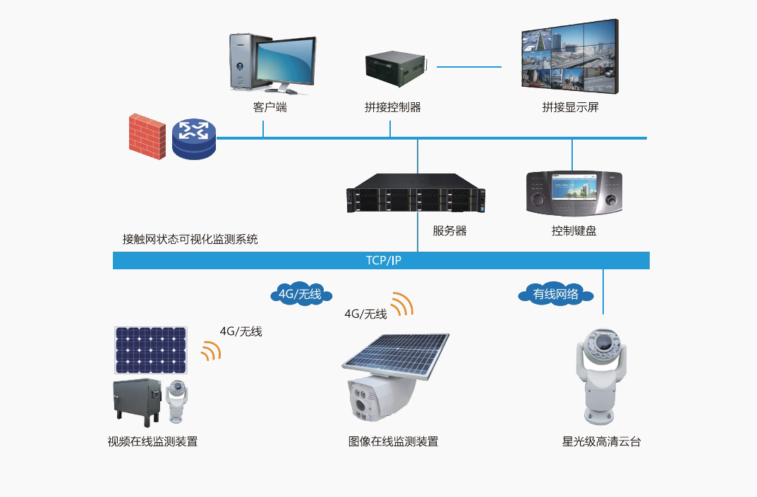 鐵路供電的特點(diǎn)是線路長,地點(diǎn)偏僻,環(huán)境復(fù)雜,單純依靠人工巡檢效果差,安全風(fēng)險大,隱患重重,供電安全直接影響著鐵路運(yùn)輸?shù)恼V刃颉=佑|網(wǎng)狀態(tài)可視化監(jiān)控系統(tǒng)是一套全方位監(jiān)管電氣化鐵路牽引供電線路的遠(yuǎn)程巡檢系統(tǒng),該系統(tǒng)根據(jù)高速鐵路供電設(shè)備運(yùn)行的安全需求,可對上跨橋、上跨電力線、隧道出入口、大風(fēng)區(qū)等重點(diǎn)位置進(jìn)行圖像/視頻監(jiān)測,對故障事件起到“早發(fā)現(xiàn)、早預(yù)防”的作用,保障高速鐵路運(yùn)營秩序,保障電氣化鐵路接觸網(wǎng)高效、安全、可靠的運(yùn)行