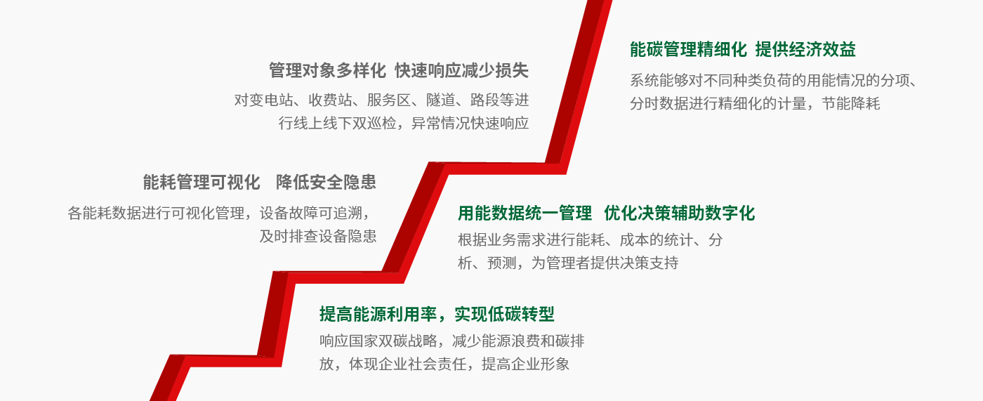 高速公路隧道、收費站、服務區(qū)的日常運營能耗的監(jiān)測管理既是實現(xiàn)“碳達峰、碳中和”的重點工作,也是企業(yè)實現(xiàn)綠色低碳發(fā)展的迫切需要,同時通過能耗在線監(jiān)測,可有效發(fā)現(xiàn)“滴冒跑漏”,節(jié)能降耗,有利于企業(yè)降本增效。
