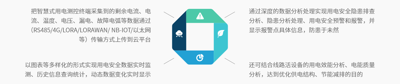 簡介: 智慧式用電安全隱患監(jiān)管服務(wù)系統(tǒng)采用物聯(lián)網(wǎng)及大數(shù)據(jù)分析技術(shù),全面采集電氣參量,不間斷的對引發(fā)電氣火災(zāi)的主要因素(如漏電流過大、溫度異常過流、過欠壓、過載、不平衡等)進(jìn)行數(shù)據(jù)跟蹤與統(tǒng)計分析,實時發(fā)現(xiàn)電氣線路和用電設(shè)備存在的安全隱患,分析用電用能情況,向安全管理人員發(fā)送預(yù)警信息,指導(dǎo)開展隱患治理、輔助運維工作,消除潛在的電氣火災(zāi)危險,實現(xiàn)防患于未燃。